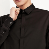 Slim Fit Mens Shirt / Stretch Cotton Poplin Fabric / Mens Black Long Sleeve Shirt / Classic Neckline / Concealed Button Front Closure / Buttoned Cuffs / Small Chest Logo