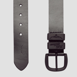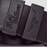 Vegetable Tanned Leather / Engraved Matte Black Buckle and Keeper Set / Debossed Longhorn on Tip / 1 1/2" Width / An R.M. Williams Staple / Pair The Drover With Your Favourite Boots and Finish any Outfit With This Timeless Wardrobe Staple