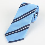 • A sky, navy and white regimental stripe men's tie in a woven microfibre blend