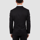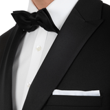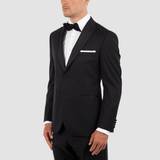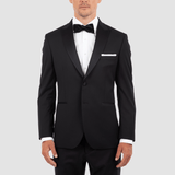 Slim Fit Black Tuxedo Suit / Single Breasted 2 Button Front / Satin Peak Lapel / Satin Trim Pockets and Double Vents / A Comfortable Stretch Fabric