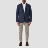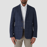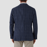 Slim Fit Mens Linen Sports Jacket / Denim Blue / Stone Coloured Windowpane Check Design / Natural shoulder / Notch Lapel / 2 Button Front / Patch pOCKETS. / Side Vents / Half Lined / Available in A Regular and Short Fit