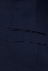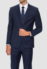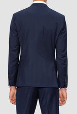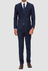Slim Fit Mens Navy Suit / Twill Weave / Notch Lapel / 2 Button Front / Hidden Ticket Pocket / Straight Pocket Flaps / 5 Overlapping Buttons at Cuff / Side Vents at Back / 57mm Lapel