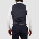 Tailored Fit Navy Vest / Four Button Front / Satin Back with Adjustable Tab / Pair with the Jesse or Noah Suit Trouser and the Abram Suit Jacket or Tuxedo Suit Jacket.
