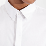 Slim Fit Mens Shirt / Stretch Cotton Poplin Fabric / Mens White Long Sleeve Shirt / Classic Neckline / Concealed Button Front Closure / Buttoned Cuffs / Small Chest Logo