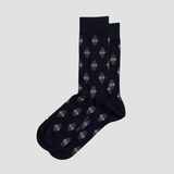 A Versatile Crew Length Mens Navy Sock / Cotton Blend / Geometric Jacquard Pattern / Metallic Logo Detail / Cuffed Ankle