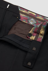 Flat Front / Slant Pockets to Front / Button Welt Pockets to Back / Zip Fly with Hook and Bar Fastening / Belt Looped Waistband / Printed Lining / A Formal Dinner Trouser